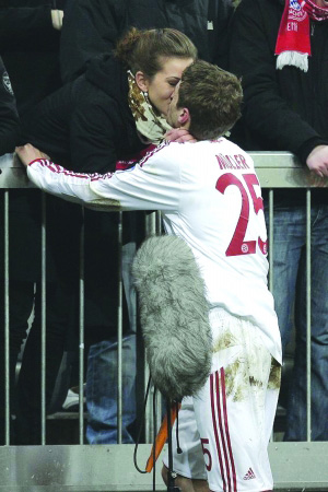這位在租借而來的前鋒多諾萬回到美國大聯(lián)盟之后才得到出場機(jī)會(huì)的小將,在昨晨比賽的第72分鐘登場,這也是他在歐冠聯(lián)賽中的處子秀,然而17分鐘過后,他就在一次角球混戰(zhàn)中攻入了個(gè)人的歐冠聯(lián)賽處子球。進(jìn)球后的穆勒顯得非常興奮,飛奔到看臺(tái)上女友所在的位置,而他的女友很默契地送上了浪漫一吻。看到這對(duì)恩愛的小情侶,現(xiàn)場所有觀眾都送出了自己的掌聲。