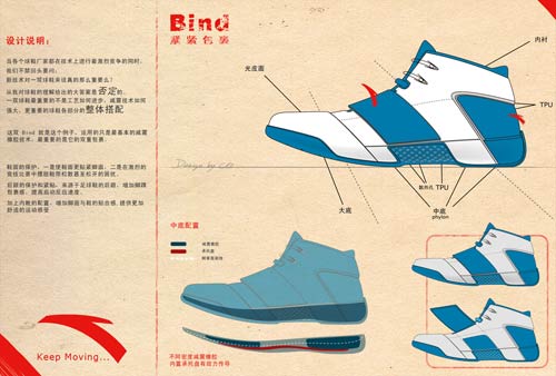 評委從外觀到用材,從設計創意到人體工程學等方方面面對參賽作品進行考察,入選作品能夠最終落入大賽評委“法眼”的根本原因在于設計的獨特創意以及作品中所體現出的深厚的運動專業主義素養。比如戰袍作品“長城”,以長城作為CBA戰袍的設計源頭,言簡意深;俠影的設計靈感分別來源于古代披風,唐裝,五線譜,天馬行空4種元素,極具英雄浪漫主義色彩;“ANTA--‘箭魚’籃球鞋”,取材于海洋生物——箭魚,鞋身整體造型以流線型為主,色彩明快,動感十足;戰靴“Bind-緊緊包裹”,設計強調鞋面的包裹性,后腳踝的包裹性,和前掌的反應速度,定位于速度反應型后衛選手,并且提供良好的保護;“My Design My CBA”戰靴作品,設計中STAR主題貫穿鞋面,大面積的紅令人眼前一亮。而在后跟的承托上大面積的透明TPU,從后跟一直包裹到鞋身上,大大增強了鞋的穩定性,保證在猛烈的切入動作時,雙腳不會產生側滑……
