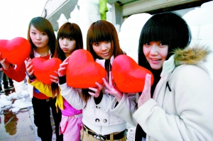 2月14日,山東濟南,CBA山東黃金俱樂部的4名單身籃球寶貝互相贈送禮品,共度情人節。