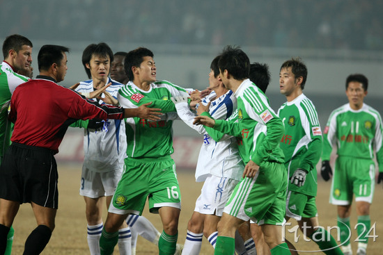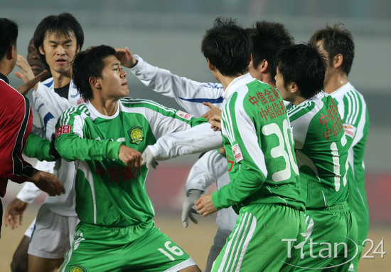 11月12日,北京國安與天津泰達賽后,雙方爆發(fā)斗毆,黃博文(16號)與對方毆打。