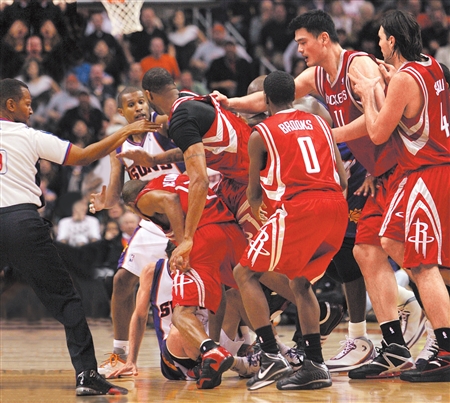 NBA比賽絕對能給人以強(qiáng)烈的視聽沖擊,每一場比賽你甚至能聽到“肌肉碰撞”的聲音。因此,在這個大個子們、壯漢們充塞的賽場,可以想見雄性荷爾蒙的濃度——一個動作或者一次口角都會點燃一場毆斗。比如昨天火箭與太陽的比賽,一個帶有挑釁性的肘部動作就引來雙方大打出手——為了自家兄弟,決不能在氣勢上輸陣——所以你才看到了好好先生姚明沖將上去。不過,這種場面對于見慣了NBA大場面的球迷,根本就是小菜一碟!