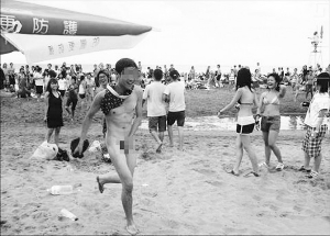 在網絡上,一張名為“火箭勝湖人,深圳球迷被迫裸奔”的貼圖瘋傳。發帖者稱,此深圳球迷王×,乃湖人當家球星科比的粉絲,之前在網上揚言火箭勝湖人他就裸奔,不幸言中,被網友們人肉搜索,要求他兌現承諾。發帖者甚至稱要求王×裸奔的還有其女友,因女友乃不折不扣的火箭球迷。王×在重重壓力之下遂面對現實,兌現承諾。于是5月5日下午的大梅沙海濱沙灘上,出現這樣一幕場景:一名男子脖套花內褲,手捂下體,向大海奔去,臉帶幾分笑意,幾分羞澀。