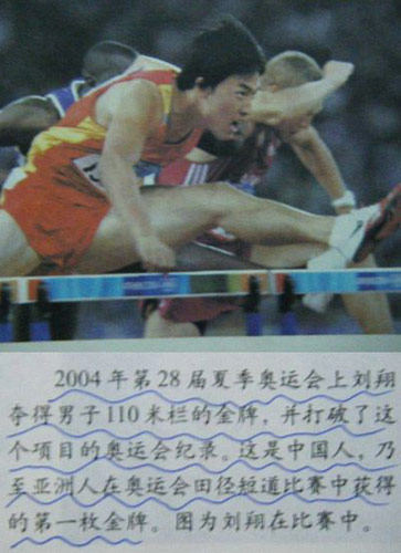 在圖片下附著的文字說明這般寫道:“2004年第28屆夏季奧運會上劉翔奪得男子110欄的金牌,并打破了這個項目的奧運會紀錄。這是中國人乃至亞洲人在奧運會田徑短道比賽中獲得的第一枚金牌。圖為劉翔在比賽中。”