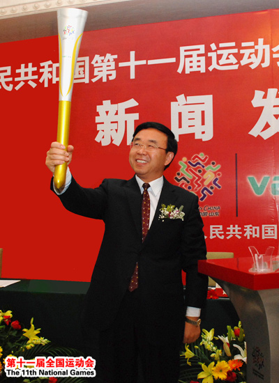 十一運會火炬“如意”4月28日在濟南正式亮相。圖為十一運組委會副主任、山東省副省長黃勝為十一運會火炬式樣揭幕。(曹亮 攝)
