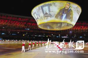 在預(yù)演現(xiàn)場(chǎng),宏大的聲勢(shì)和“道具”令人震撼。就像北京奧運(yùn)會(huì)開(kāi)幕式用極具中國(guó)特色的畫(huà)卷作為核心道具展示古老神秘的東方文化,本次全運(yùn)會(huì)上有一個(gè)特別作品,那就是一個(gè)巨型的碗狀帷幕。在晚間預(yù)演中,這個(gè)直徑大約有50米的“巨碗”從地面上緩緩升起,懸空而置。形成了一個(gè)類(lèi)似巨型背投的裝置。隨著地面上節(jié)目的不斷變化,投射在“碗”幕上的影像也會(huì)不斷變換,制造強(qiáng)烈的視覺(jué)沖擊。