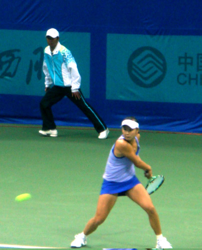 一襲紫裝、淺笑盈盈,率領(lǐng)天津隊(duì)奪得了中國(guó)第十一屆運(yùn)動(dòng)會(huì)濟(jì)南賽區(qū)首枚金牌的彭帥,和隊(duì)友李喆信步走進(jìn)中心賽場(chǎng)。四年前的南京,同樣是這個(gè)天津姑娘,十九歲的她站在領(lǐng)獎(jiǎng)臺(tái)上淚流滿(mǎn)面,隨即賭氣似地摘下項(xiàng)上的銀牌。誰(shuí)都知道,她想要的是金牌。四年后的濟(jì)南,十一運(yùn)會(huì)網(wǎng)球女子團(tuán)體賽中她拿到了金牌。今天,她又微笑著回來(lái)了。在今天上午的女子單打中,彭帥當(dāng)仁不讓?zhuān)远攘銠M掃北京隊(duì)趙依靜。
