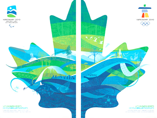 冬奧會和冬季殘奧會海報的主體都是半片楓葉,不同的是前者楓葉靠左,右上角是2010年冬奧會會徽;后者靠右,左上角為2010年冬季殘奧會會徽。兩者拼接在一起,則構成一片完整的楓葉。與傳統(tǒng)上象征加舀大的紅色楓葉不同的是,這兩張海報上的楓葉顏色是藍鸀白相間,代表著溫哥華冬天的顏色--藍天、大海和雪山。楓葉上充滿動感的、不同形狀的線條,以及冰球、花樣滑冰和高山滑雪等項目的插圖則傳達著冬奧會的元素。