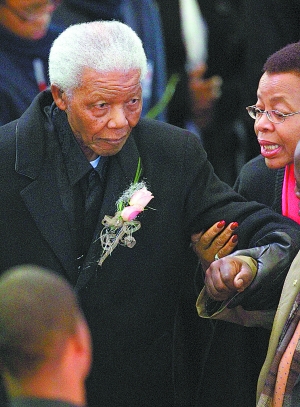 澤娜妮是在世界杯開幕前夜不幸遇難的,91歲高齡的曼德拉也因此取消了出席開幕式的計劃。上午8時,悼念儀式在學校禮堂舉行。熱愛音樂的澤娜妮生前是該校唱詩班和樂隊的成員,幾乎每個人都喜歡這位性格開朗、活潑的小女孩。儀式以一首悼念歌曲開始,緊接著播放了一組幻燈片,由澤娜妮與曼德拉開心擁抱的合影組成。隨后,幾位親屬代表上前致悼詞。老曼德拉也在親人的陪伴下,步履蹣跚地來到儀式現場,他的衣襟上別著一小簇粉紅色的花束,始終坐在前排,神情十分哀傷。