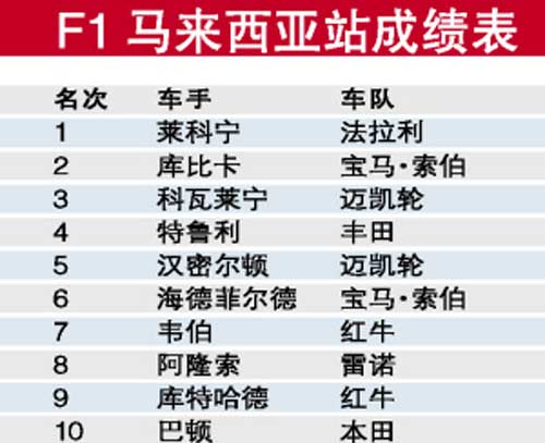昨天下午,世界一級方程式錦標賽馬來西亞大獎賽結束。法拉利車隊芬蘭車手萊科寧優勢明顯輕取冠軍,來自波蘭的寶馬車手庫比卡和另一位芬蘭人邁凱輪車手科瓦萊寧分獲亞軍和季軍。上站比賽獲勝的邁凱輪車隊英國車手漢密爾頓位居第五。本站桿位得主法拉利巴西車手馬薩退賽。本站賽后,積14分的漢密爾頓仍然領先車手積分榜。邁凱輪積24分繼續領跑車隊積分榜。