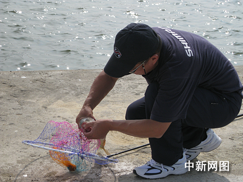 有一名來自安徽的選手顯然是這路“武功”里的豪放派。當魚急著四處游走想擺脫魚鉤的束縛時,這位“大俠”卻好整以暇地以單手控竿,巧妙地跟著魚的力量調整好釣線的角度,最后猛地使出一個“拔蔥式”——一條大魚頓時從水里“一飛沖天”,頗為委屈地重重拍在了地上。