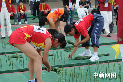 “剛開始感覺(插秧)很有趣,不過練起來可就沒那么輕松了。”這是林貴婷談到比賽時印象最深的一點。記者在現場看到,比賽在60米長的直跑道上進行,選手需先挑起籮筐,單手依次拾起20米處扎成捆的的塑料秧苗,然后在一塊鉆有300個小孔的綠色木板上進行比賽。