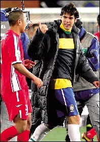 賽前大屏幕用視頻方式公布各隊(duì)首發(fā)名單,卡卡出現(xiàn)時(shí),引發(fā)了全場最響亮掌聲和尖叫聲。當(dāng)卡卡踏上球場,球迷的呼喊聲也是最大的。但比賽中的卡卡讓球迷失望了。卡卡每次拿球身邊總會(huì)有3名球員包夾。帶球被搶斷、傳球不到位、多次被撞翻,甚至帶球急停時(shí)摔跤。很顯然,卡卡的身體狀態(tài)非常糟糕。第80分鐘,卡卡被換下。賽后,心煩的卡卡甚至拒絕了鄭大世交換球衣的要求。