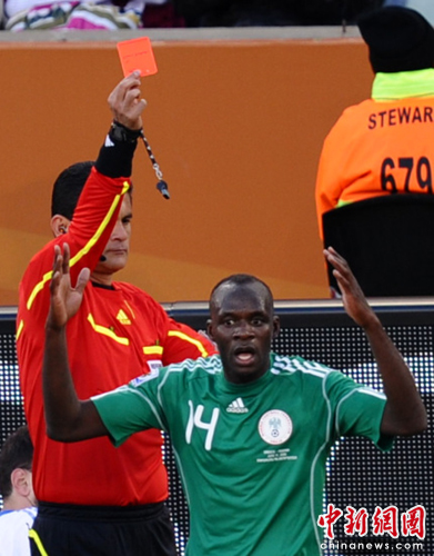 第33分鐘場上的局勢急轉直下,卡拉古尼斯的遠射被尼日利亞后衛頂出。半分鐘后,尼日利亞的凱塔在無球的情況下故意蹬踏托羅西迪斯,結果被主裁判直接出示紅牌罰下!非洲雄鷹不得不擺出鐵桶陣以十人應戰。希臘隊禁區中路一次連續的角球傳遞,卡拉貢尼斯把球直塞到禁區內,薩爾皮吉迪斯面對門將倒地鏟射被門將撲出。