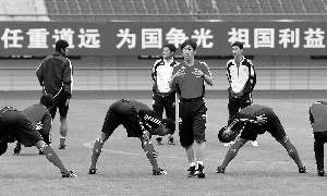 昨日上海驟然降溫,淅淅瀝瀝的小雨悄然而至,國(guó)家隊(duì)下午5時(shí)出現(xiàn)在訓(xùn)練場(chǎng)上,金山體育中心為國(guó)足打出“任重道遠(yuǎn)、為國(guó)爭(zhēng)光、祖國(guó)利益高于一切”的橫幅。主帥高洪波身穿紅衣短袖,而助理教練傅博、區(qū)楚良則身穿白底的運(yùn)動(dòng)外套,在國(guó)家隊(duì)隊(duì)員的包圍中,甚至很難辨別出少帥之身份。國(guó)安隊(duì)及山東隊(duì)的6名隊(duì)員由于航班原因遲到,因此首堂訓(xùn)練課由25名隊(duì)員參與。由于國(guó)足隊(duì)員上周末剛打完職業(yè)聯(lián)賽,因此首堂訓(xùn)練課主要以恢復(fù)性訓(xùn)練為主。訓(xùn)練內(nèi)容從慢跑開(kāi)始,隊(duì)員們并沒(méi)有成群結(jié)隊(duì)一同跑,而是三三兩兩地分開(kāi)慢跑,鄭智、王新欣與周海濱分成一組,慢跑中隊(duì)員不時(shí)聊天談笑,氣氛顯得十分輕松,絲毫不覺(jué)聯(lián)賽過(guò)后的疲憊。隨后在傅博的帶領(lǐng)下,隊(duì)員分成三組進(jìn)行搶圈訓(xùn)練,高洪波則在一旁當(dāng)“監(jiān)工”。在訓(xùn)練尾聲,以高洪波領(lǐng)銜的教練組與國(guó)足一同慢跑,此次慢跑持續(xù)了超過(guò)20分鐘。一個(gè)半小時(shí)的訓(xùn)練結(jié)束后,山東魯能的4名隊(duì)員韓鵬、王永珀、吳昊及劉金東才姍姍來(lái)遲,此時(shí)助教傅博氣喘噓噓地喊隊(duì)醫(yī)尹煜華說(shuō):“拿著表,盯著他們跑20分鐘啊。”尹大夫只好在雨中“獨(dú)訓(xùn)”國(guó)腳。