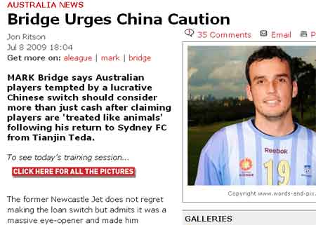 中新網(wǎng)7月9日電 布里奇,一個(gè)天津泰達(dá)隊(duì)球迷都不會(huì)陌生的名字。這位澳大利亞外援曾在本賽季初效力于天津泰達(dá)隊(duì),現(xiàn)在已經(jīng)離開中超加盟悉尼FC隊(duì)。日前他在接受澳大利亞《442》雜志采訪時(shí)憤怒的回憶了在中超的悲慘生活。他表示,中超的球員就像畜生一樣被對待。