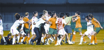 1:2落后,澳大利亞姑娘們似乎眼睛都紅了!兇猛得近乎男足的飛鏟在最后的時(shí)刻頻頻上演,無(wú)論是中國(guó)隊(duì)還是澳大利亞隊(duì)都在咬著牙堅(jiān)持著。傷停補(bǔ)時(shí)的到來(lái)使得這場(chǎng)較量進(jìn)入白熱化,門(mén)將張?jiān)降囊淮问軅沟爻蔀閷?dǎo)火索,澳大利亞隊(duì)認(rèn)為中國(guó)隊(duì)是在故意拖延時(shí)間,兩隊(duì)頓起糾紛,雙方替補(bǔ)席上的非比賽人員均沖入場(chǎng)內(nèi),一陣混亂過(guò)后,一名中國(guó)隊(duì)教練和澳大利亞隊(duì)后衛(wèi)都被出示黃牌,如此激烈的判罰引起了澳大利亞球員的普遍不滿(mǎn)……