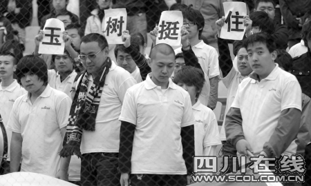 昨日下午,中超、中甲聯賽激戰數場。賽前,雙方球員,在場球迷均為玉樹罹難同胞致哀以寄哀思。昨日賽前,中國足協、中超聯賽委員會及中超公司決定在中超聯賽第四輪的8場比賽入場前,安排比賽雙方球員手拉印有“玉樹賑災系國人”、“一方有難八方支援”的標語入場,并組織默哀活動。中國足協、中超聯賽及16家中超俱樂部將共同向玉樹災區捐助賑災款100萬元人民幣,并通過中國紅十字基金會轉交。