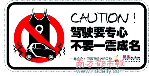 在剛剛結束的車展上,網(wǎng)易為推廣《亞運文明公約》,特推出了一套以“孫悅車震事件”為主題的搞笑車貼向觀眾派發(fā)。車貼上寫著:駕駛要專心,不要一震成名。現(xiàn)場不少參觀者看到“孫悅車貼”后,都忍不住咧嘴偷笑。