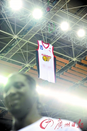 儀式開始前,積臣和宏遠(yuǎn)集團(tuán)公司董事長一起拉下了遮簾,他的15號(hào)球衣在東莞體育館上空高高掛起,這是5冠王俱樂部第一件退役的球衣。