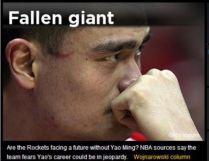 中新網6月30日電 北京時間今日凌晨,雅虎體育以“巨人的墜落”為題報道稱:姚明腳踝傷勢已非常嚴重,可能缺席下賽季大部分常規賽。隨后美國媒體紛紛對此事發表評論。