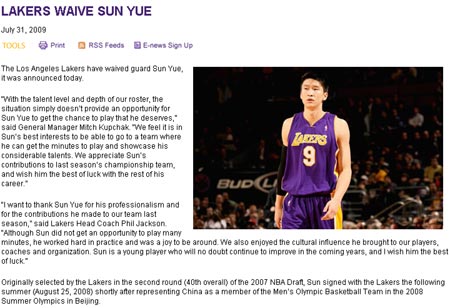 中新網(wǎng)8月1日電 當?shù)貢r間7月31日,NBA上賽季冠軍湖人隊通過官方網(wǎng)站,宣布放棄來自中國的后衛(wèi)孫悅。
