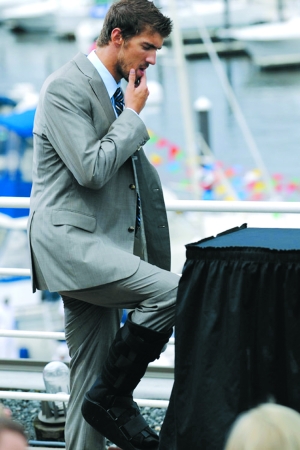 對菲爾普斯來說,戰(zhàn)勝奧尼爾似乎不那么簡單,因為他在之前的車禍中弄傷了右腳,發(fā)布會上,他全程都用護(hù)具緊緊包裹著傷腳,但是菲爾普斯笑著說:“兵不厭詐,這個護(hù)具將會對奧尼爾造成困惑,他一定會迷惑我到底能發(fā)揮到幾成,哈哈,我們賽場上見。”