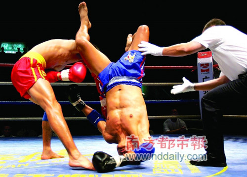 面對泰拳五大王咄咄逼人的挑戰,中國武術協會終于接下戰書。中國功夫對職業泰拳爭霸賽組委會本周公布:本次比賽將于12月在佛山舉辦。賽事以中國武術散打規則為基礎,融合部分泰拳規則,允許交戰雙方運用膝肘等技術進攻對手,每場賽事五個回合,每個回合三分鐘。