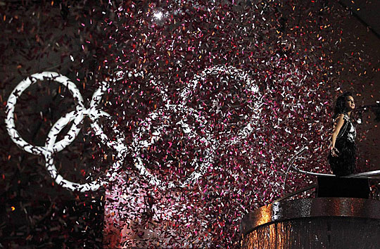 在閉幕式正式開始前還有個小插曲:會場中央的火炬臺仍處在開幕式時的“殘缺”狀態。一個裝扮成電工的小丑來到會場,找到了一根沒有被正確連接的電源線,爾后,在小丑賣力拉動之下,那根開幕式上沒有豎起來的歡迎柱緩緩豎起來了。開幕式上的一個錯誤在今天舉行的閉幕式上被以一種幽默的方式糾正過來。