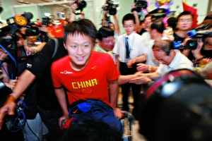 張琳推著行李車,走在運動員隊伍的最前面,他接連接過兩束鮮花。攝影記者將他團團圍住,閃光燈閃爍個不停。昨天中午,中國游泳隊載譽返京,在首都機場張琳成為最受關注的明星。接受采訪的間隙,還忙著給粉絲簽名。