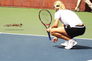 昨天中午,正當眾多大腕在訓練場進行最后練習的時候,一只松鼠突然闖入訓練場。突然面對這么多人、還有這么多來回移動的網球,受到驚嚇的小松鼠有些不知所措。在場地周圍來回奔跑,甚至橫穿了德娃正在訓練的球場。中途,它還遇到一只網球擋路,它還不得不跟網球“搏斗”了一番,引得場外球迷的一片驚訝聲。