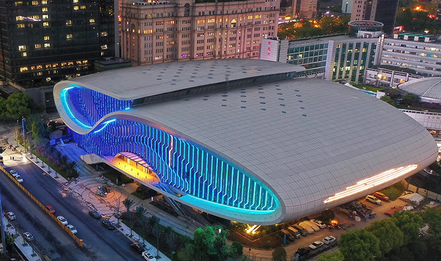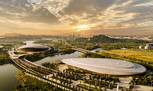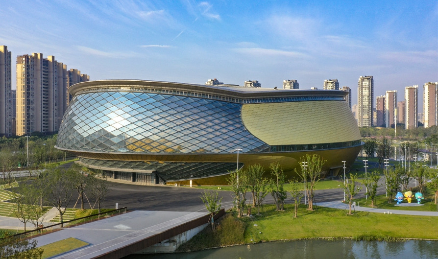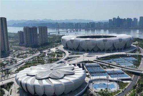 杭州奧體中心游泳館為亞運(yùn)會(huì)游泳、跳水、花樣游泳項(xiàng)目比賽場(chǎng)館及訓(xùn)練場(chǎng)館,位于杭州市蕭山區(qū),總建筑面積53959平方米,觀眾席位數(shù)約6000個(gè),是一個(gè)集游泳、跳水比賽和訓(xùn)練為一體的專(zhuān)業(yè)運(yùn)動(dòng)場(chǎng)館。場(chǎng)館擁有雙館合一的設(shè)計(jì)理念、獨(dú)特的流線造型,結(jié)合雙層全覆蓋銀白色金屬屋面,和兩翼張開(kāi)的平臺(tái)形式……作為世界上最大的兩館連接體非線性造型場(chǎng)館,無(wú)論白天夜晚,顏值都超高。