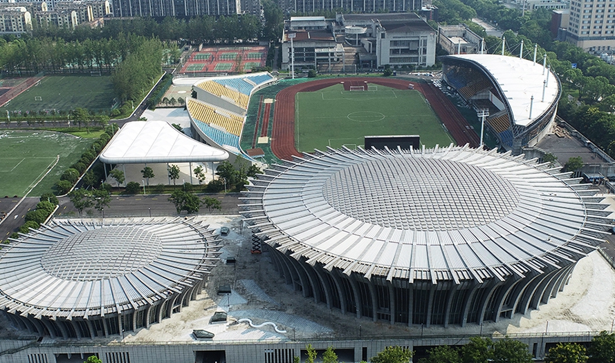 浙江大學(xué)(紫金港校區(qū))體育館為亞運(yùn)會(huì)籃球項(xiàng)目比賽場(chǎng)館,位于杭州市西湖區(qū),在亞運(yùn)村西北側(cè)且相距約22公里。該場(chǎng)館位于浙大紫金港校區(qū)內(nèi),東側(cè)為風(fēng)雨操場(chǎng),北側(cè)為游泳館,空間高度整合,幾個(gè)場(chǎng)館形成一個(gè)綜合性體育場(chǎng)區(qū)。總建筑面積16954平方米,觀眾席位數(shù)4821座。