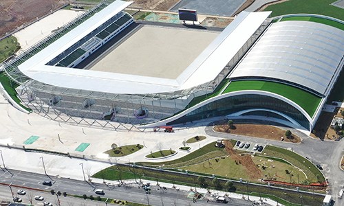 紹興棒(壘)球體育文化中心為亞運(yùn)會(huì)棒壘球項(xiàng)目比賽場(chǎng)地,位于紹興柯橋區(qū)和鏡湖新區(qū)交界處、杭紹臺(tái)高速公路鏡湖互通附近。其中,棒球項(xiàng)目用地面積 120666平方米,總建筑面積 145000 平方米,其中地上建筑面積89200平方米,地下建筑面積55800平方米。功能區(qū)包括一個(gè)棒球主場(chǎng)(座位數(shù)5000個(gè)),一個(gè)棒球副場(chǎng)(座位數(shù)2500個(gè)),一個(gè)集訓(xùn)中心和一個(gè)體能訓(xùn)練館。壘球項(xiàng)目用地面積 42666平方米,建筑面積8000平方米,含一個(gè)壘球主場(chǎng)(座位數(shù)2000個(gè)),一個(gè)壘球副場(chǎng)(座位數(shù)500個(gè))。