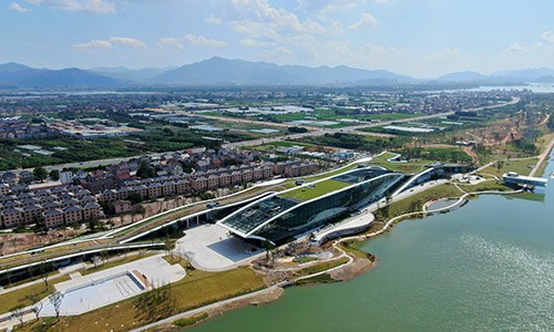 溫州龍舟運(yùn)動(dòng)中心為亞運(yùn)會(huì)龍舟項(xiàng)目比賽場(chǎng)地及訓(xùn)練場(chǎng)館,位于溫州市甌海區(qū),含綜合館、終點(diǎn)塔及觀龍臺(tái)。龍舟競(jìng)渡在溫州已有二千年歷史,溫州市被稱(chēng)為“中國(guó)龍舟名城”,該基地賽后將永久性保留,作為全國(guó)最專(zhuān)業(yè)的龍舟競(jìng)賽基地。總建筑面積23713平方米,觀眾席位數(shù)344座,沿河兩岸約有20000個(gè)站席。