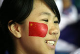 亞運會舉重賽場的看臺上,孩子們臉上貼著亞運標志觀看比賽。