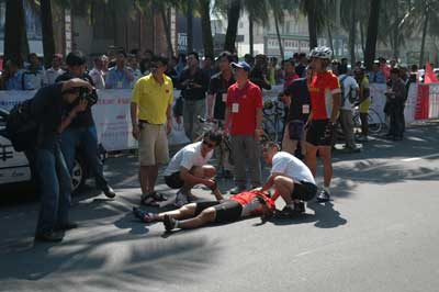昨天,由海馬汽車贊助的2007環海南島國際公路自行車賽結束第三賽段爭奪,雖然本賽段比較平,難度不大,但卻意外發生中國隊選手惠國與攝影記者碰撞事件。記者昨天采訪了解到,惠國身體多處擦傷,退出比賽的可能性非常大。