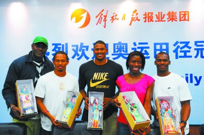 座談會(huì)上,還有北京奧運(yùn)會(huì)男子4×100米冠軍成員,牙買加隊(duì)的弗雷德和卡特,北京奧運(yùn)會(huì)女子400米金牌獲得者奧古魯格,雅典奧運(yùn)會(huì)和北京奧運(yùn)會(huì)兩屆女子三級(jí)跳冠軍姆邦哥。他們和奧利弗,都是第一批抵達(dá)上海參加黃金大獎(jiǎng)賽的運(yùn)動(dòng)員,此次受到解放日?qǐng)?bào)報(bào)業(yè)集團(tuán)和解放日?qǐng)?bào)領(lǐng)導(dǎo)的熱忱接待,并因收到了如穆桂英、孫悟空、趙云等京劇人偶,以及中國筷子等極具中國特色的禮物,而充滿驚喜。