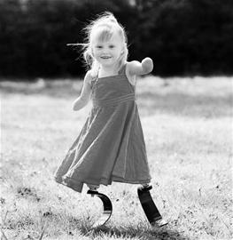 埃莉在16個月大時患上嚴重的腦膜炎,引發了敗血癥,導致四肢肌肉全部壞死。為了挽救埃莉的生命,醫生通過6小時的手術截掉了她開始發黑的四肢。手術數周后,埃莉便穿戴上了生平第一套假肢。可是由于它不夠靈活,加上穿著起來很痛苦,埃莉每天穿假肢的時間不超過20分鐘。“無肢女童”埃莉的不幸遭遇經媒體報道后,感動了無數英國人。2006年12月,在眾多好心人的資助下,埃莉換上一副可移動的高科技假手和假腿。有了這副帶膝關節的假腿之后,埃莉即便不借助任何輔助物支撐,也能獨自站立3分鐘。剩余的大部分時間,她只需一副迷你行走支架,便可保持全身穩定,甚至可以獨立爬上樓梯。靠著一雙假臂,埃莉可以自己穿衣,甚至可以夾著一把牙刷完成刷牙這樣的“高難動作”。