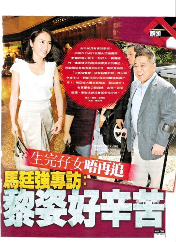 記者問他有沒有進產(chǎn)房陪太太,馬廷強說:“我沒進產(chǎn)房。黎姿要打麻醉針,加上我拄著拐杖,不是很方便,所以留在產(chǎn)房外等。她生完BB后從手術(shù)室出來,我就立刻去看她。”