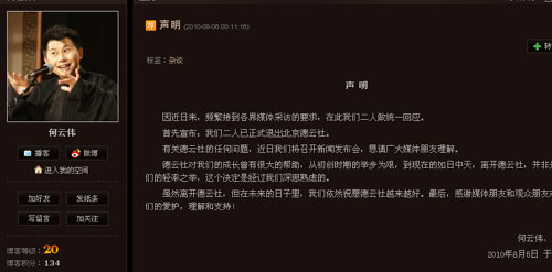 中新網8月6日電 今天凌晨,相聲演員何云偉在其個人博客上發表聲明,稱已和李菁一起正式退出德云社。在其聲明中,并未提及退出德云社的理由,不過何云偉表示,二人近期將舉行新聞發布會,向公眾說明情況。