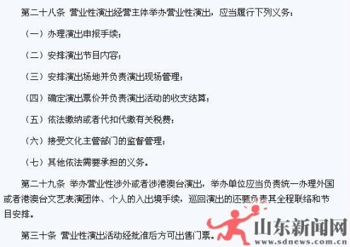 根據我國09年出臺的最新《營業性演出管理條例實施細則》第二十八條規定,營業性演出經營主體舉辦營業性演出,應當履行辦理演出申報手續、安排演出節目內容、接受文化主管部門的監督管理等義務。緊接著,第三十條規定,營業性演出活動經批準后方可出售門票。在《細則》中還明確指出,跨省區演出的,應當出具其他演出所在地省級文化主管部門的審核意見。