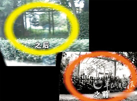 昨天上午11時(shí),記者再次來(lái)到郭宅后院,記者發(fā)現(xiàn)3個(gè)小時(shí)之前仍然存在的侵占公共綠地的綠色木柵欄已經(jīng)被拆除大部分,周邊只剩下部分被拔下來(lái)的柵欄殘骸。但是院內(nèi)假山、水池,以及綠色涼亭仍然存在。據(jù)了解,之前城管部門曾經(jīng)確認(rèn)此部分也屬違建。