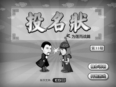 而互動惡搞《投名狀》的游戲也很有趣,就是趙二虎發現自己夫人蓮生和龐青云有染,為了挽回男人的尊嚴,他只有靠武力來證明自己是最強的,請參與游戲者幫趙二虎來挑戰龐青云。而游戲規則就是使用控制鍵,控制趙二虎挑戰龐青云,在規定時間內打敗龐青云即告勝利。在熟悉了游戲規則之后,此類惡搞并無難度系數。勝者王敗者寇,如果輸了,趙二虎會慚愧跪地說:“為什么我會輸?我才是元配!倍嬊嘣苿t會摟著蓮生說:“我是唯一的選擇,請支持壹基金!苯Y果令人忍俊不禁。