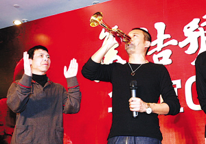 21日,是《集結號》上映“滿月”的日子,影片的出品方華誼兄弟在北京的一家會所大擺宴席,廣宴賓朋。這場“滿月席”慶祝的是《集結號》已經獲得的2.35億的全國票房。席間馮小剛導演收到了未能到場的“趙二斗”鄧超送來的一把鍍金的集結號,馮導把號交到了連長的手上,“谷子地”于是鼓起腮幫子,吹響了讓他在片中等了幾十年終究沒有聽到的號聲……