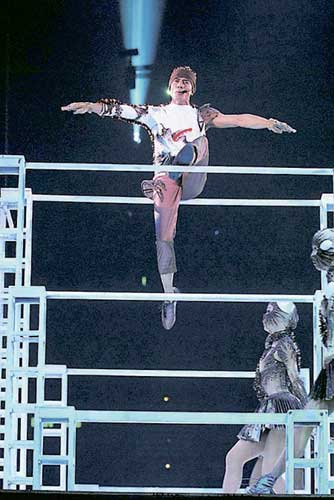 郭富城在高低杠上演出大玩危險動作。
