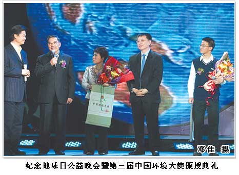 本報(bào)4月22日訊 “紀(jì)念地球日公益晚會(huì)暨第三屆中國環(huán)境大使頒授典禮”今日在京舉行。宋祖英等10人被環(huán)境保護(hù)部聘為新一屆“中國環(huán)境大使”。全國政協(xié)副主席李金華、國家發(fā)改委副主任解振華、環(huán)境保護(hù)部副部長潘岳等出席頒授典禮。