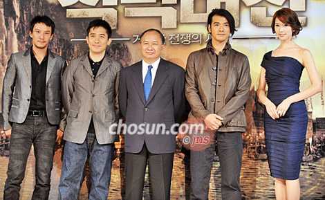 新片《赤壁》的主演梁朝偉、金城武、林志玲和導(dǎo)演吳宇森在首爾廣壯洞華克山莊酒店舉行了記者會。