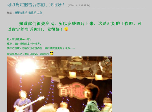 斯琴格日樂(lè)在博客中寫道:“知道你們很關(guān)注我,所以發(fā)些照片上來(lái)……可以肯定地告訴你們,我很好!”新民網(wǎng)記者在其博客中看到,斯琴格日樂(lè)在博客照片的描述中稱,自己可以做到視而不見(jiàn)。