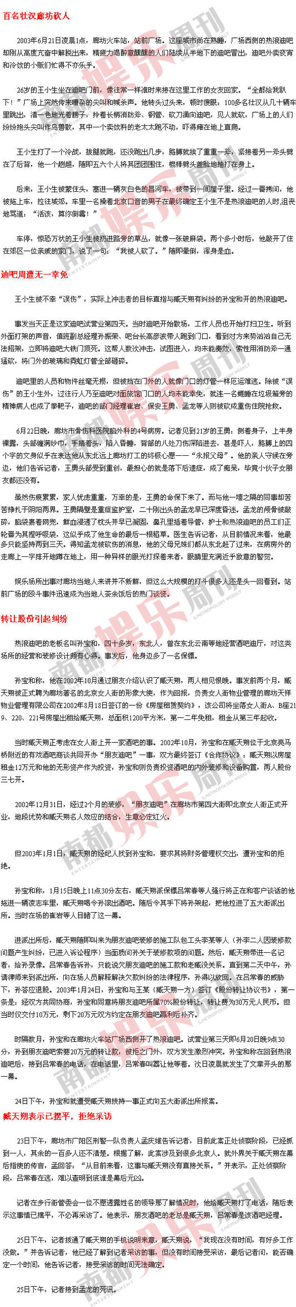2003年的我正供職于京城某家在市場上享有盛譽的報社。那年夏天,孫寶和找到報社,拿了一大堆文字資料和現場照片,聲稱自己遭黑社會迫害,幕后主謀就是歌星臧天朔。當時報社在異地采訪問題上一直相當慎重,但沒想到很快就得到領導的充分許可。我和另一名攝影記者連夜趕往廊坊進行了一周多的調查。令我深感意外的是,這么大動靜的毆斗居然沒有第二家媒體介入,更談不上披露問題,相關的細節和猜想也僅在群眾中間悄然流傳,我們成了惟一到現場采訪的記者。