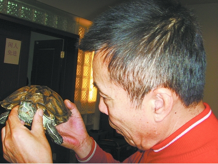 也許是看春晚小品劇本看累了,何慶魁干脆走出自己的臥室,和新買的烏龜玩了起來。一會用手輕輕撫摸烏龜的尾巴,一會用臉碰一下烏龜的背,一會用嘴親吻烏龜的頭部。何慶魁兒子何樹成告訴記者:“老爸跟它親熱得很!其實這個烏龜才買來幾天!焙螒c魁笑著說,這個烏龜跟他有緣,親手養了幾天,烏龜跟他特別親近!八F在都不怎么吃東西了,經?s頭不肯動,但是我抱起它,摸摸它,它就會伸頭出來看看我,和我親親!